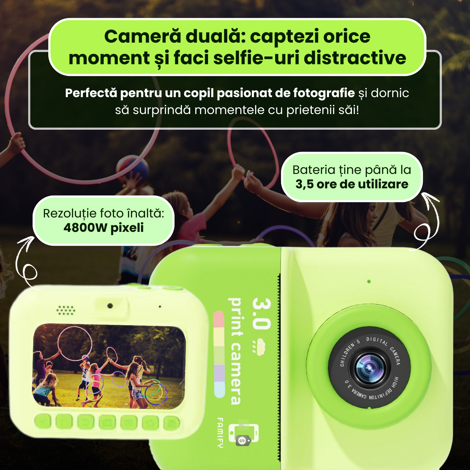 Cameră Foto Instant Tip Polaroid pentru Copii Famify – 48MP, Video HD, Imprimare Termică, Set Cadou Verde