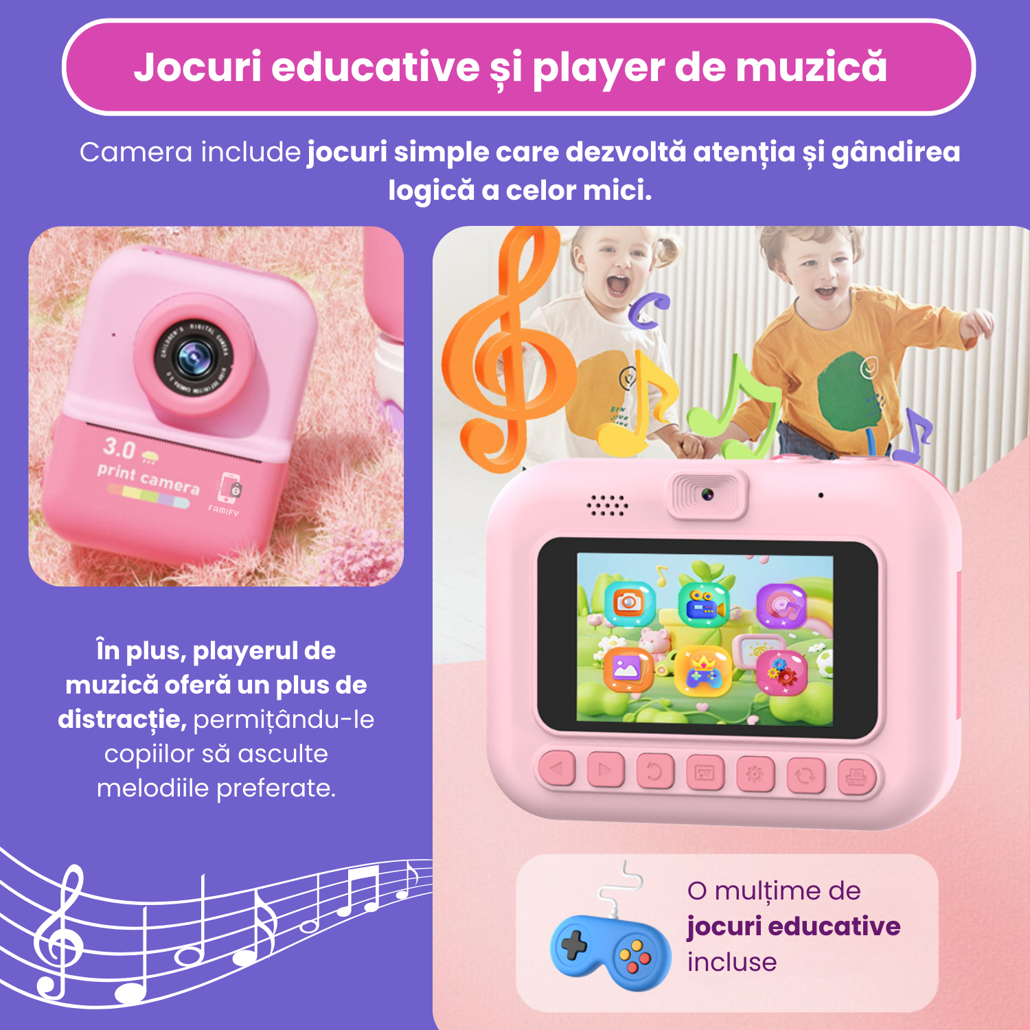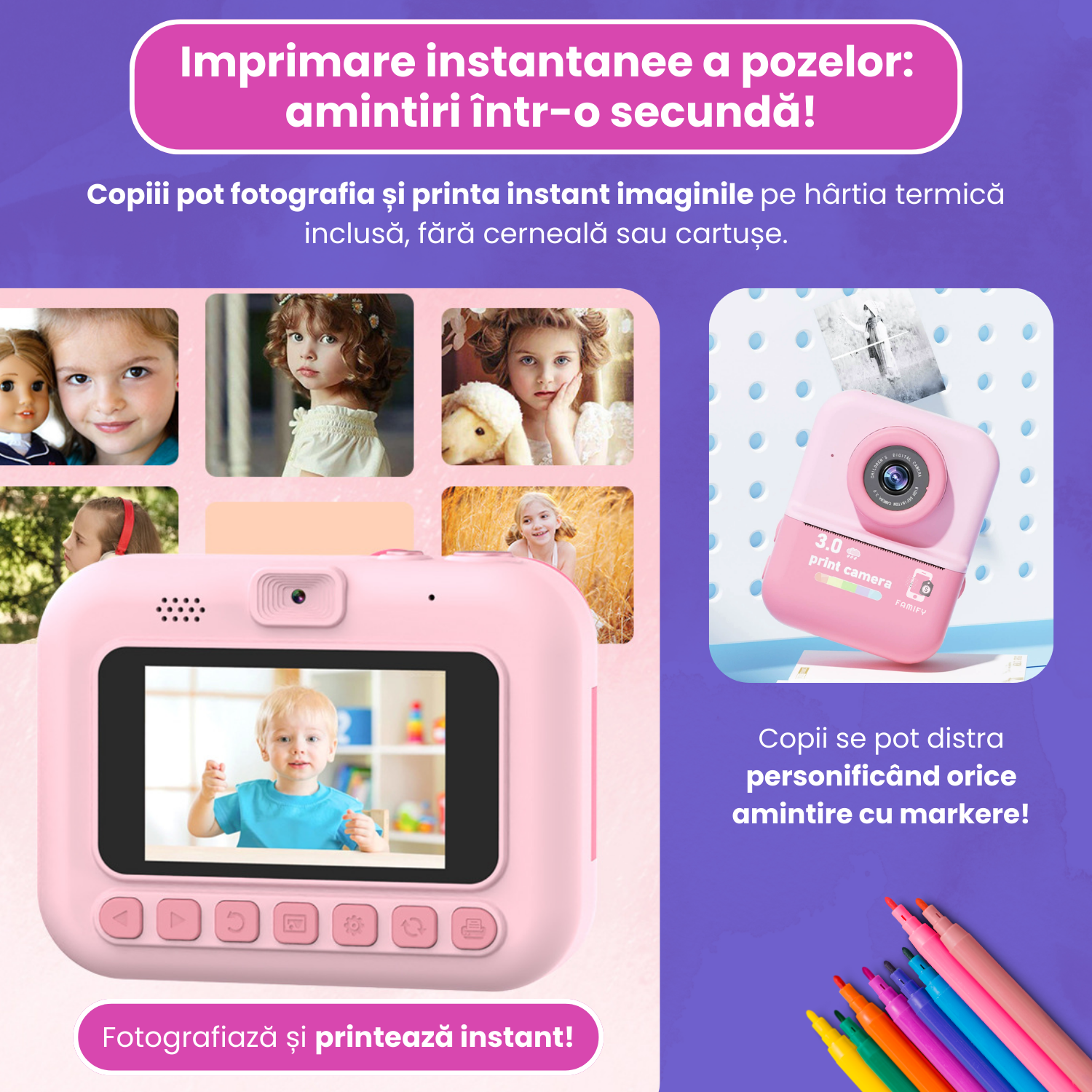 Copiii pot fotografia si printa instant imaginile pe hartia termica inclusa, fara cerneala sau cartuse. Hartia imprimata poate fi colorata cu markerele din pachet si decorata cu stickere, transformand fiecare poza intr-o amintire unica. Aceasta functie ii incurajeaza pe cei mici sa experimenteze arta prin fotografie si desen.