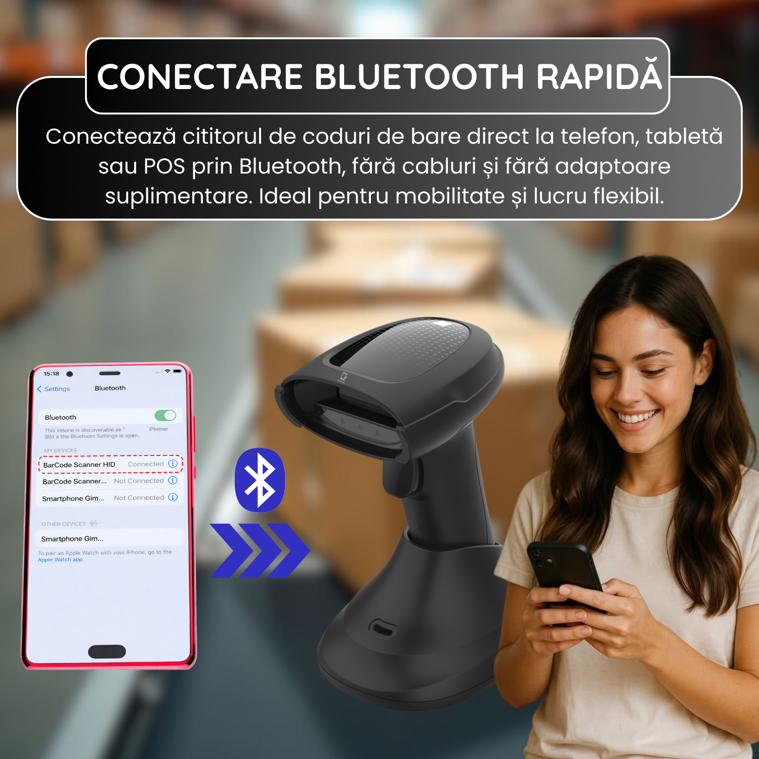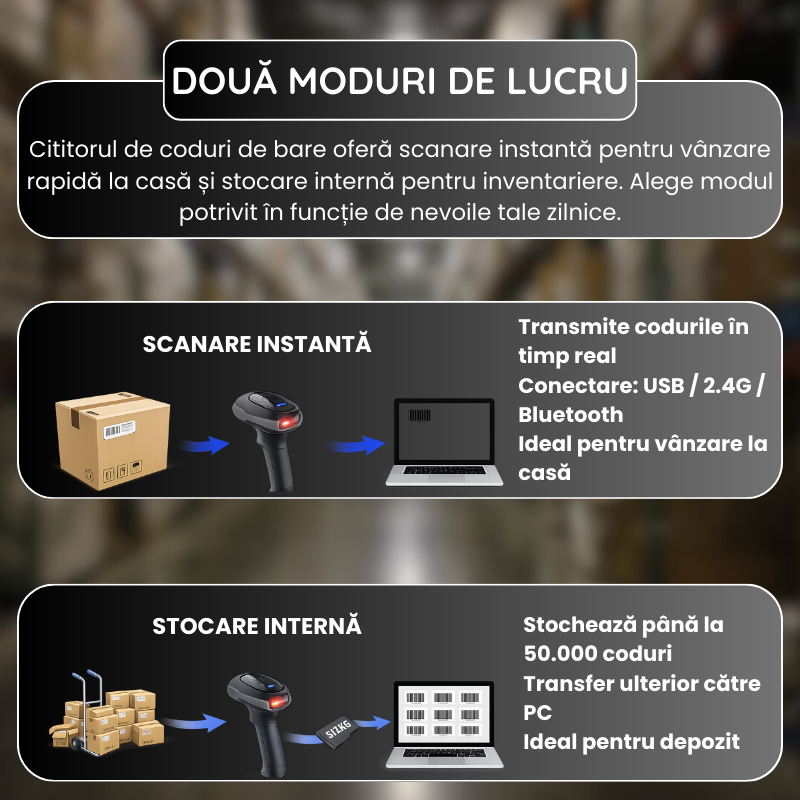 L-am cumpărat pentru depozit și casă și m-a ajutat mult la viteză. Se leagă rapid atât pe receiver, cât și pe Bluetooth, iar scanarea e precisă inclusiv la QR-uri de pe telefon. Auto-scanul e util când ai multe produse. Per total, practic și stabil pentru lucru zilnic, nu pentru hale mari.