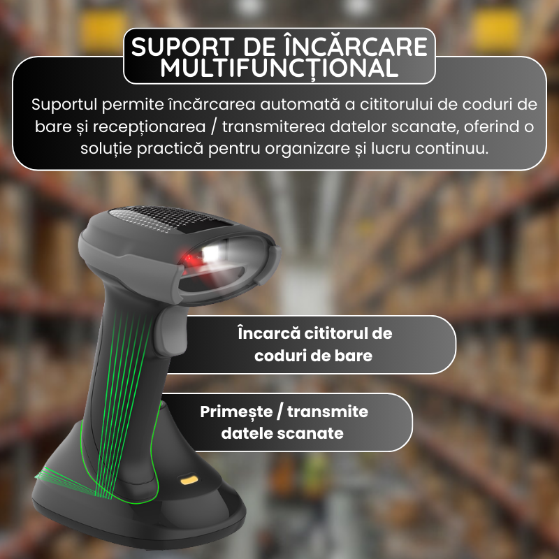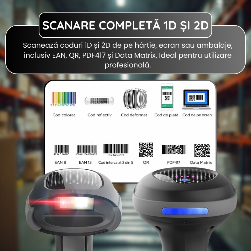 Acest cititor de coduri de bare 2D wireless este solutia ideala pentru afacerile care au nevoie de rapiditate, precizie si fiabilitate. Fie ca este utilizat la casa, in depozit sau pentru inventariere mobila, dispozitivul ofera performanta profesionala si flexibilitate maxima.