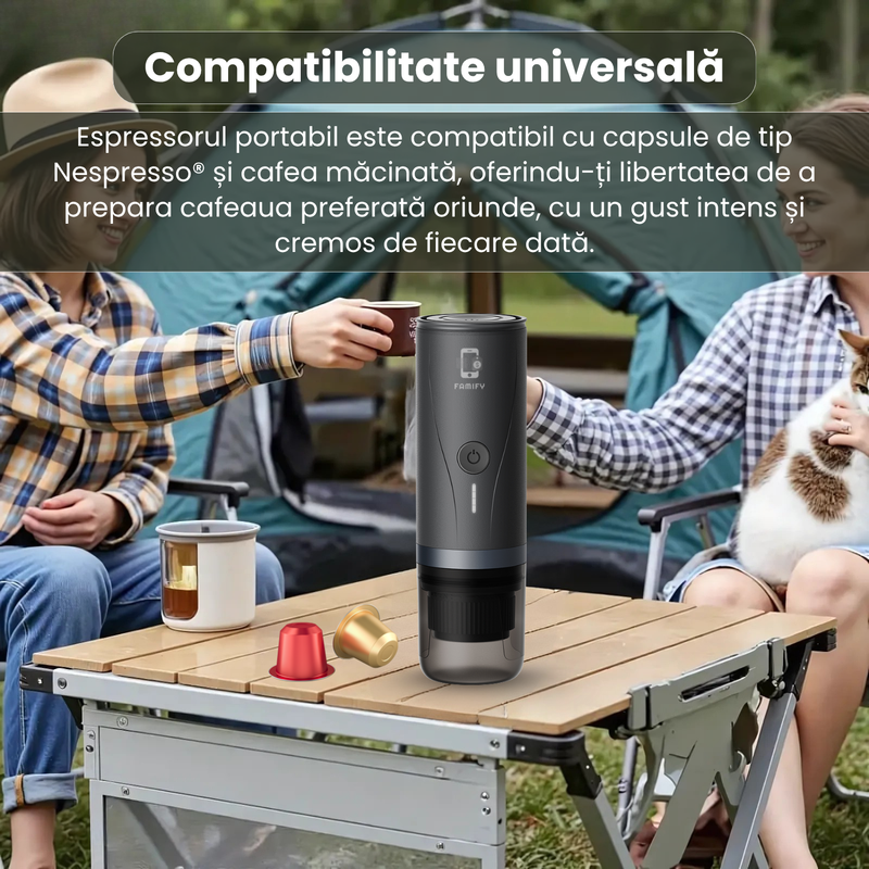 Espressorul portabil Famify PCM03 este compatibil cu capsule de tip Nespresso® și echivalente ca dimensiune, oferind o extracție aromată și consistentă.