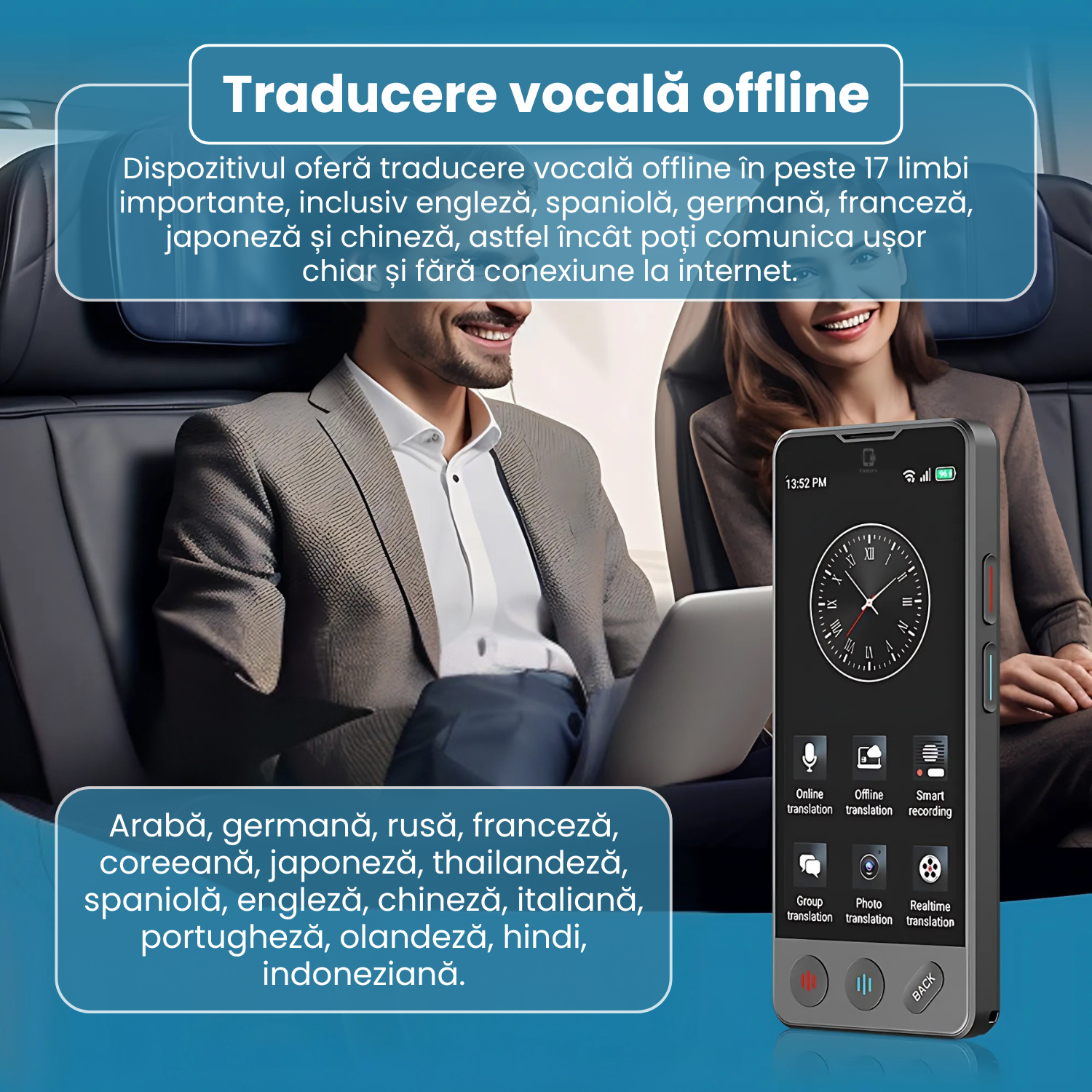 Dispozitivul este dotat cu optiuni multiple de conectare, inclusiv WiFi si date mobile, pentru a functiona optim in orice locatie. Acest lucru garanteaza acces la traduceri rapide si precise, indiferent daca te afli intr-o sala de conferinte, intr-un spatiu public sau in deplasare.